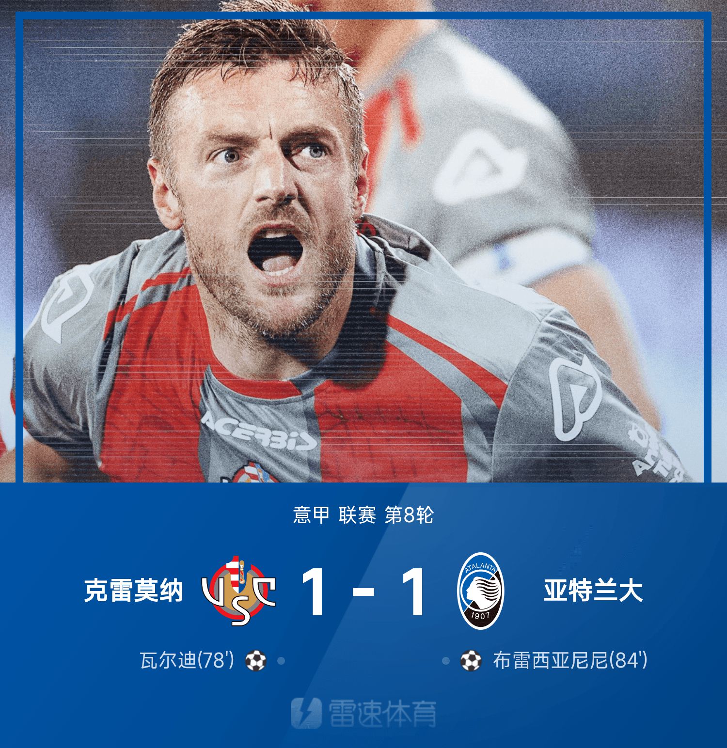 รายงานการแข่งขันกัลโช่ เซเรียอา วาร์ดี้ยิงประตูแรกในเซเรียอา เครโมน่า 1-1 อตาลันต้า