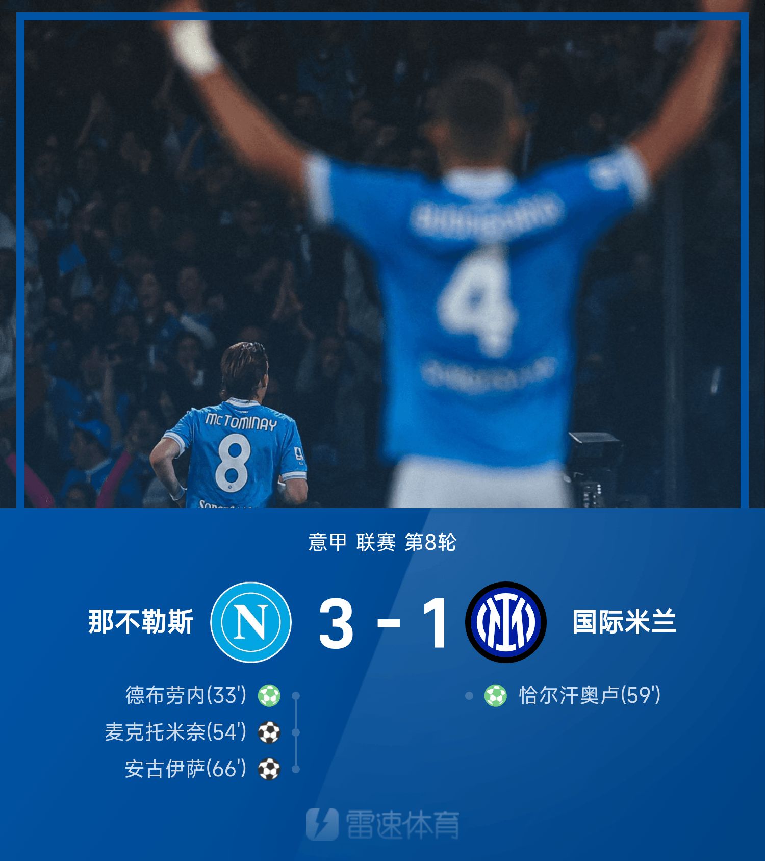 6686 กีฬา 26 ตุลาคม ในรอบที่ 8 ของฤดูกาล 25/26 กัลโช่ เนเปิลส์ เอาชนะอินเตอร์ มิลาน 3-1 ครึ่งแรกของเกม เดอ บรอยน์ ได้รับบาดเจ็บหลังจากเตะจุดโทษจากระยะ 12 หลา ในครึ่งหลังของเกม แม็คโทมิเนย์ และอังกุสซ่า ยิงประตูได้ต่อเนื่อง ขณะที่คัลฮาโนกลู ยิงประตู 12 หลา ให้อินเตอร์ มิลาน