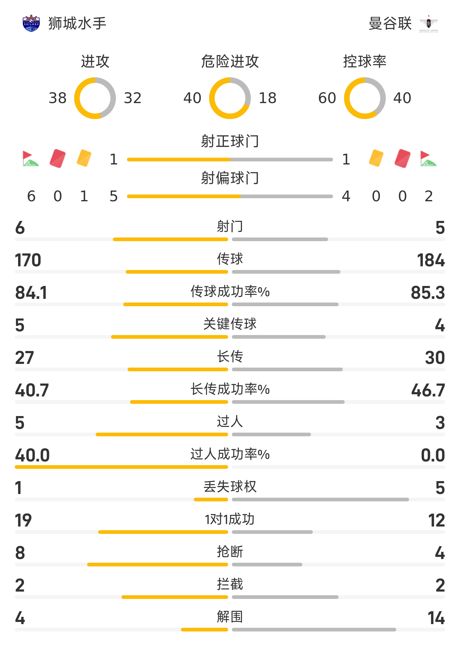 แบงค็อก ยูไนเต็ด รายชื่อผู้เล่นตัวจริง: 38-ชินพร, 29-ผู่หัวตง, 6-นิติบอน, 21-อาฮาน, 43-สุระชัย, 33-โคโซวิช, 14-นากามูระ จิงย่า, 7-อาซิชี่, 28-นาชา, 20-กันตาบัง, 17-จิ่วเฉิง เซิงย่า