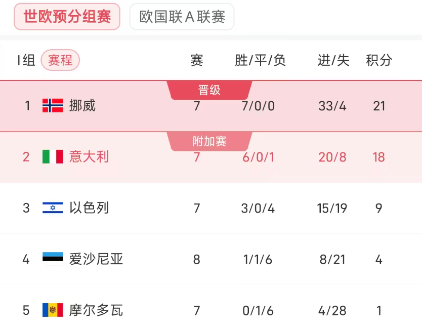 ในกลุ่ม I ปัจจุบันนอร์เวย์รั้งอันดับหนึ่งด้วย 21 แต้ม อิตาลีรั้งอันดับสองด้วย 18 แต้ม อิสราเอล (9 แต้ม) เอสโตเนีย (4) และมอลโดวา (1) ล้วนสูญเสียความหวังในการแข่งขันเพื่อชิงสองอันดับแรก