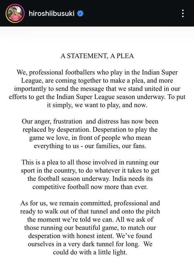 กองหน้าชาวญี่ปุ่น ฮิโรชิ อิบุซึกิ อดีตผู้เล่นของลีกตะวันตกและปัจจุบันเล่นให้กับเบงกอลตะวันออก เขียนด้วยความโกรธต่อลีก: "เราคือกลุ่มนักฟุตบอลอาชีพที่แข่งขันในอินเดียนซูเปอร์ลีก วันนี้เราร่วมกันออกแถลงการณ์นี้และออกคำอุทธรณ์: เราหวังว่าลีกจะเริ่มต้นใหม่โดยเร็วที่สุด ในประโยคเดียว - เราต้องการเล่นฟุตบอลและเราต้องการที่จะเล่นตอนนี้"