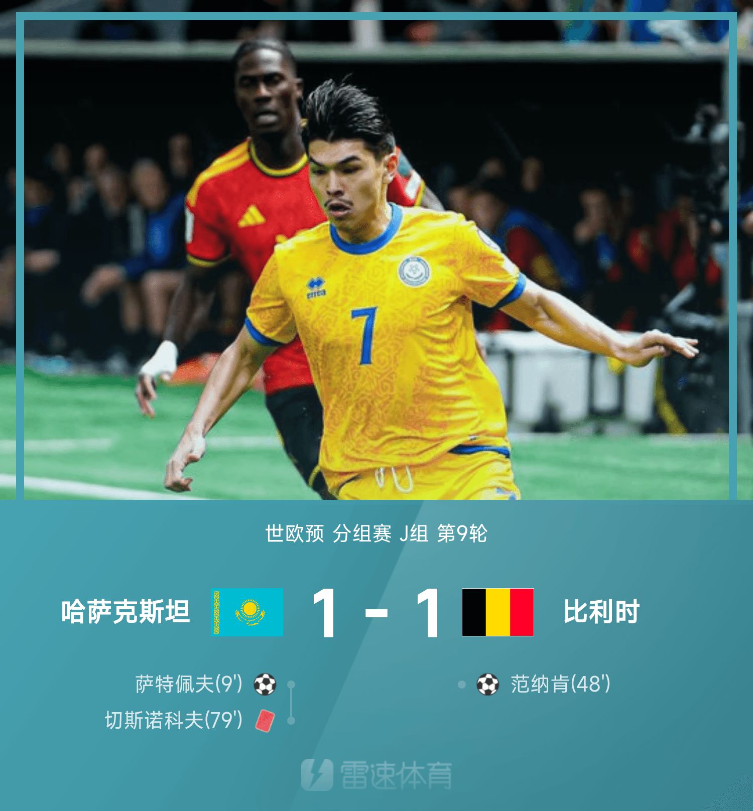 6686 Sports รายงานเมื่อวันที่ 15 พฤศจิกายนว่าในรอบที่ 9 ของกลุ่ม J ของรอบคัดเลือกโลกยุโรปครั้งที่ 26 คาซัคสถานเสมอกับเบลเยียม 1-1 ในครึ่งแรกของเกม Satepev ใช้ประโยชน์จากโอกาสของ Tate ที่จะทำประตูเดียว ครึ่งหลัง วานนาเก้นโหม่งบอลทำประตูตีเสมอ จากนั้นเบลเยียมก็เปิดเกมรุกอย่างดุเดือด เชสโนคอฟ โดนใบแดง แต่สกอร์ 1-1 ยังคงอยู่จนจบ ทำให้เบลเยียมพลาดโอกาสผ่านเข้ารอบฟุตบอลโลก