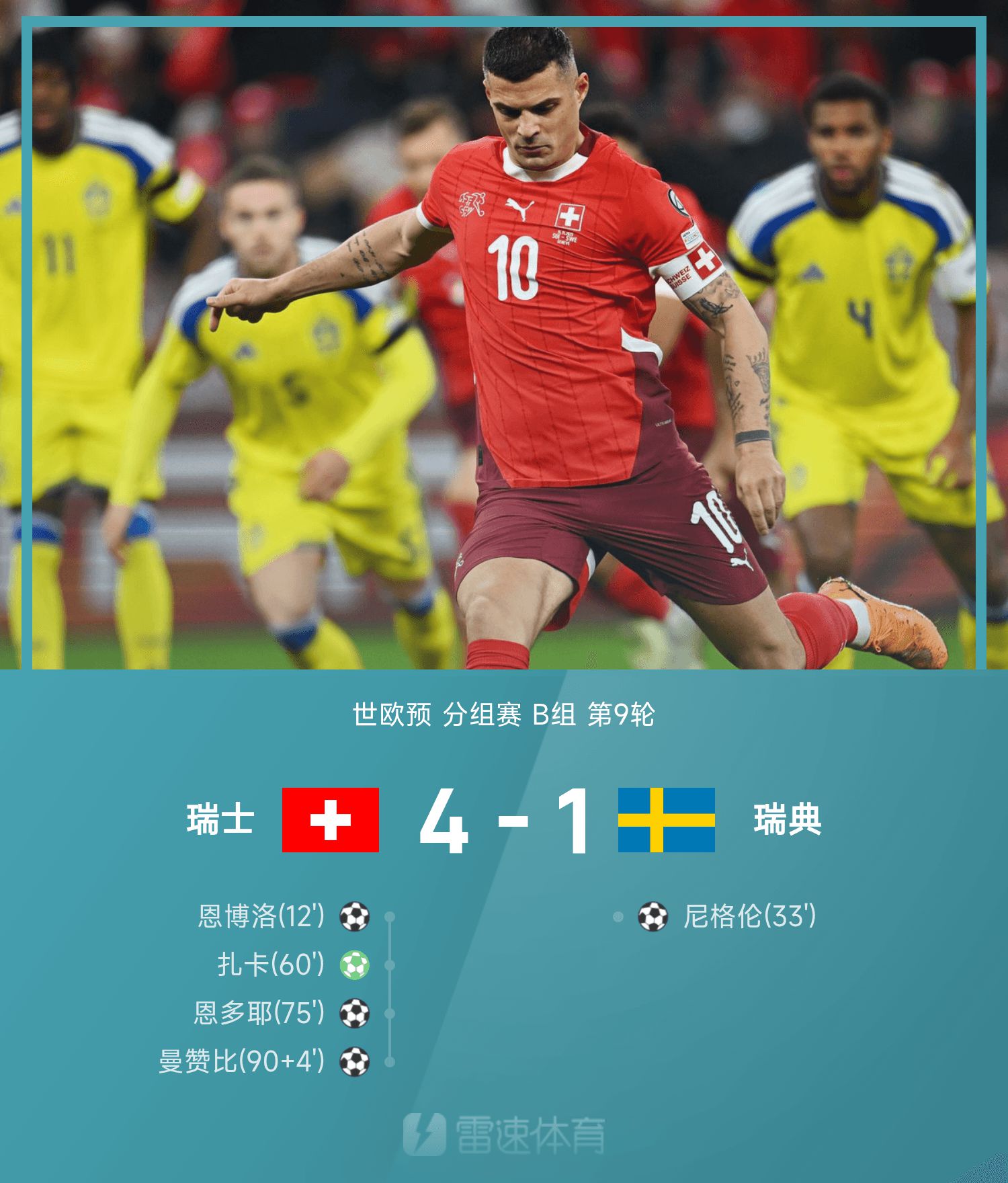 6686 Sports รายงานเมื่อวันที่ 16 พฤศจิกายนว่าในรอบที่ 9 ของกลุ่ม B ของการแข่งขันชิงแชมป์โลกยุโรปปี 2026 เจ้าบ้านชาวสวิสเอาชนะสวีเดนได้ 4-1 ในครึ่งแรกของเกม เอ็มโบโลเปิดสกอร์ให้สวิตเซอร์แลนด์ และไนเกรนยิงตีเสมอ ในช่วงครึ่งหลังของเกม Xhaka ยิงประตูได้ Ndoye ส่งบอลสำเร็จ และ Manzambi ทำประตูไอซิ่งบนเค้ก สวิตเซอร์แลนด์ขึ้นนำมี 13 แต้ม ชนะ 4 เสมอ 1 โคโซโวตามหลังจ่าฝูงมี 3 แต้ม นอกจากนี้ยังเป็นผู้นำอย่างมากในเรื่องผลต่างประตูได้เสียและยังคงมุ่งมั่นในการผ่านเข้ารอบฟุตบอลโลกในสหรัฐอเมริกา แคนาดา และเม็กซิโก