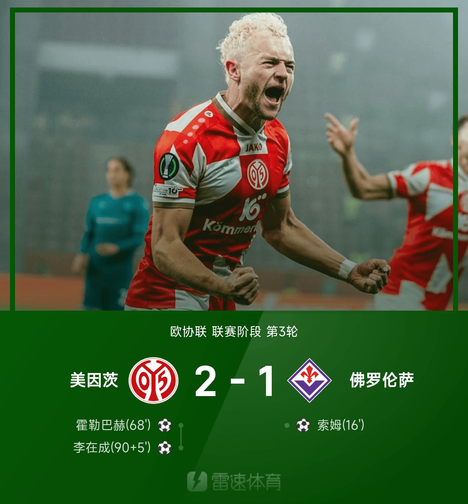 รายงานผลการแข่งขันยูฟ่า แชมเปี้ยนส์ ลีก ลี แจซอง จ่ายบอลให้ช็อตสุดท้าย ไมนซ์ 2-1 ฟิออเรนติน่า