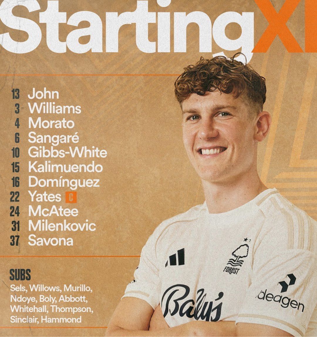 น็อตติ้งแฮม ฟอเรสต์ รายชื่อตัวจริง: 13-วิคเตอร์, 31-มิเลนโควิช, 3-วิลเลียมส์, 4-โมราโต, 37-ซาโวนา, 6-ซานกาเร่, 22-เยตส์, 10-ไวท์, 16-โดมิงเกซ, 24-แม็กคาร์ตี้, 1 5-กาลี มูเอนโด