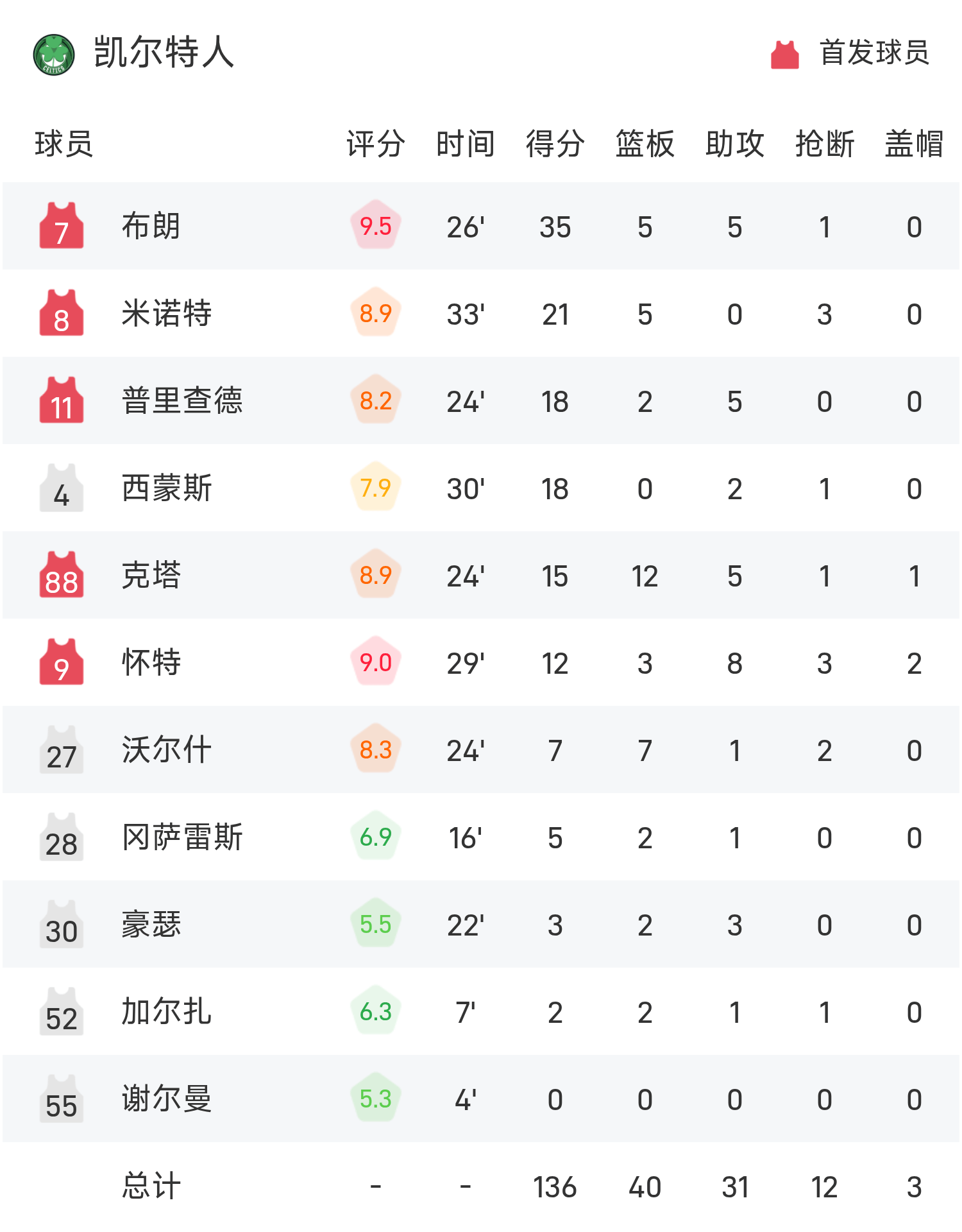 6686 กีฬา 6 พฤศจิกายน ข่าว ในฤดูกาลปกติของ NBA 25/26 เซลติกส์เผชิญหน้ากับวิซาร์ด จบเกม เซลติกส์ เอาชนะ วิซาร์ดส์ 136-107 บราวน์ทำคะแนนสูงสุดในเกม 35 แต้ม 5 รีบาวน์และ 5 แอสซิสต์ นำทีมเซลติกส์คว้าชัยชนะ