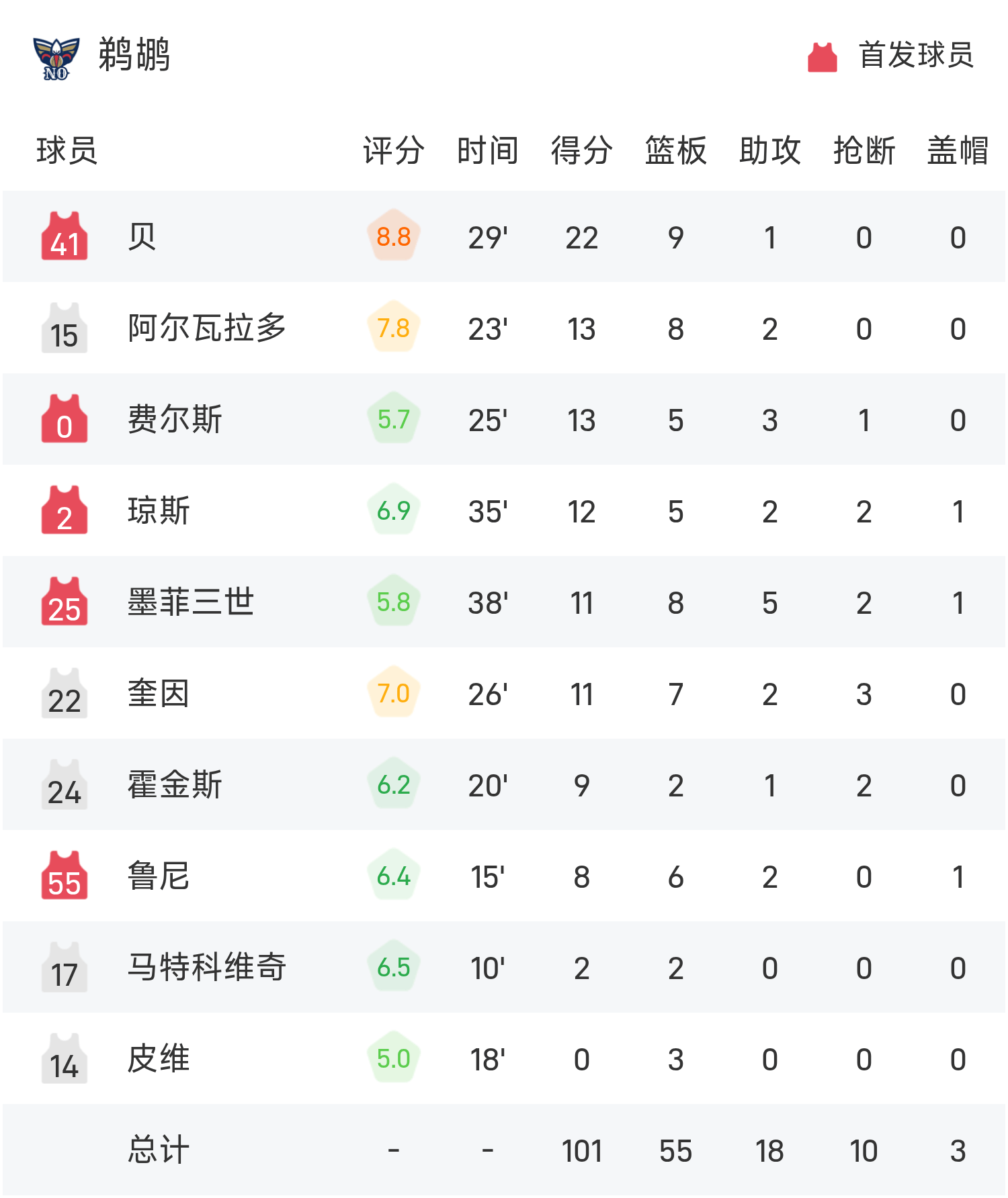 เบย์ทำคะแนนสูงสุดในเกม 22 แต้ม 9 รีบาวน์และ 1 แอสซิสต์ นำทีม Pelicans คว้าชัยชนะ แฟล็กก์ตัวเลือกอันดับต้น ๆ ของแมฟเวอริกส์พลาดเสมอกันและทำคะแนนได้ 20 แต้ม