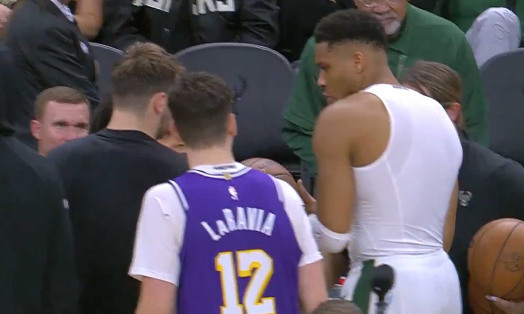 ต่อจากนั้น ผู้ตัดสินมอบลูกบอลให้กับเจ้าหน้าที่ทีมเหย้าของ Bucks หลังจากเห็นแล้ว ผู้เล่นของ Lakers ก็ก้าวออกมาข้างหน้าและอธิบายว่าต้องการเอาบอลของเกมออกไป แต่เจ้าหน้าที่ของ Bucks ก็ยังไม่มีความตั้งใจที่จะแจกมัน ท้ายที่สุด อันเทโทคูมโปเห็นจึงเดินตรงเข้าไปและยื่นบอลให้ดอนซิช ทั้งสองฝ่ายตบมือกันเพื่อแสดงมิตรภาพ