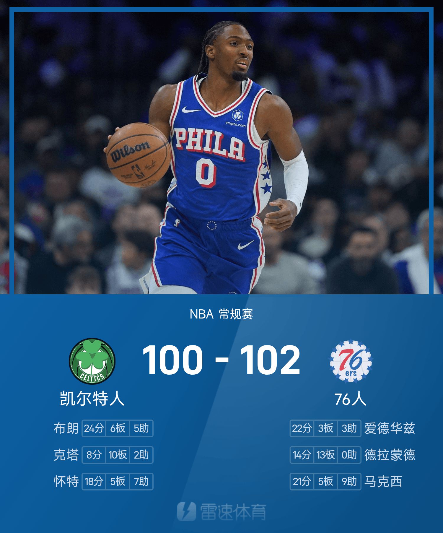 รายงานเกม NBA แม็กซี่มี 21 แต้ม 9 แอสซิสต์ 76ers เอาชนะเซลติกส์ 102-100 อย่างหวุดหวิด