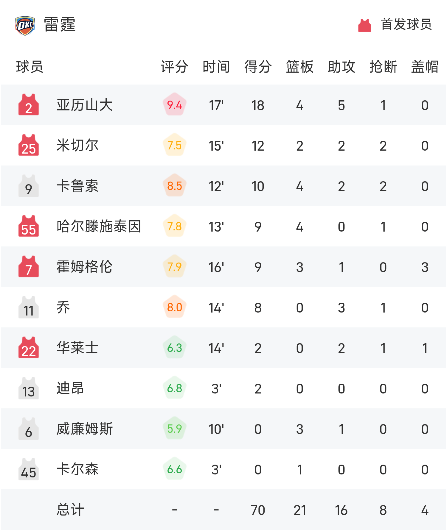 พักครึ่ง NBA: SGA 18 แต้ม, ดอนซิช 11 แต้ม, ธันเดอร์นำเลเกอร์ส 70-38