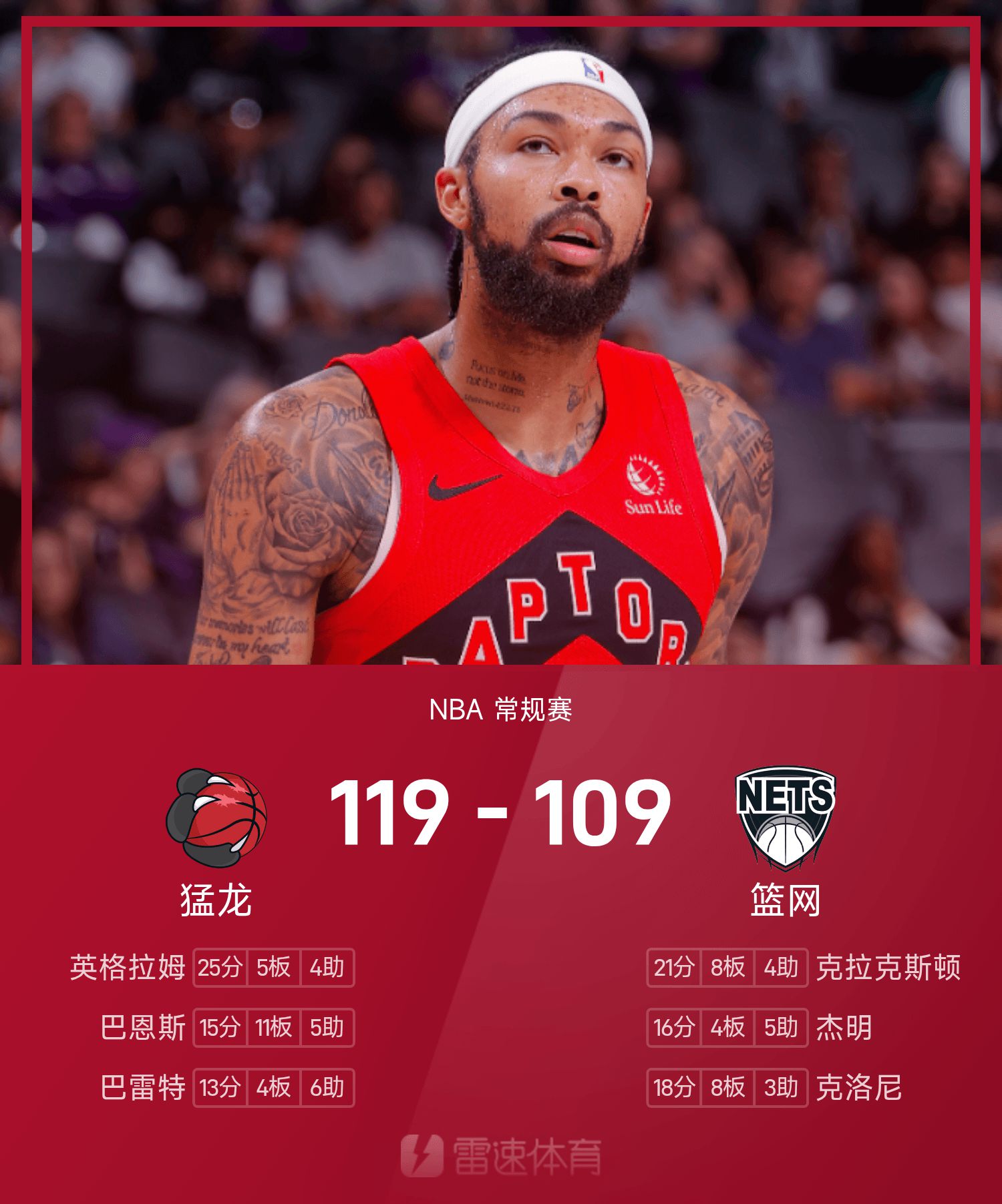 รายงาน NBA: อินแกรม 25 แต้ม แร็พเตอร์ส เอาชนะ เน็ตส์ 119-109